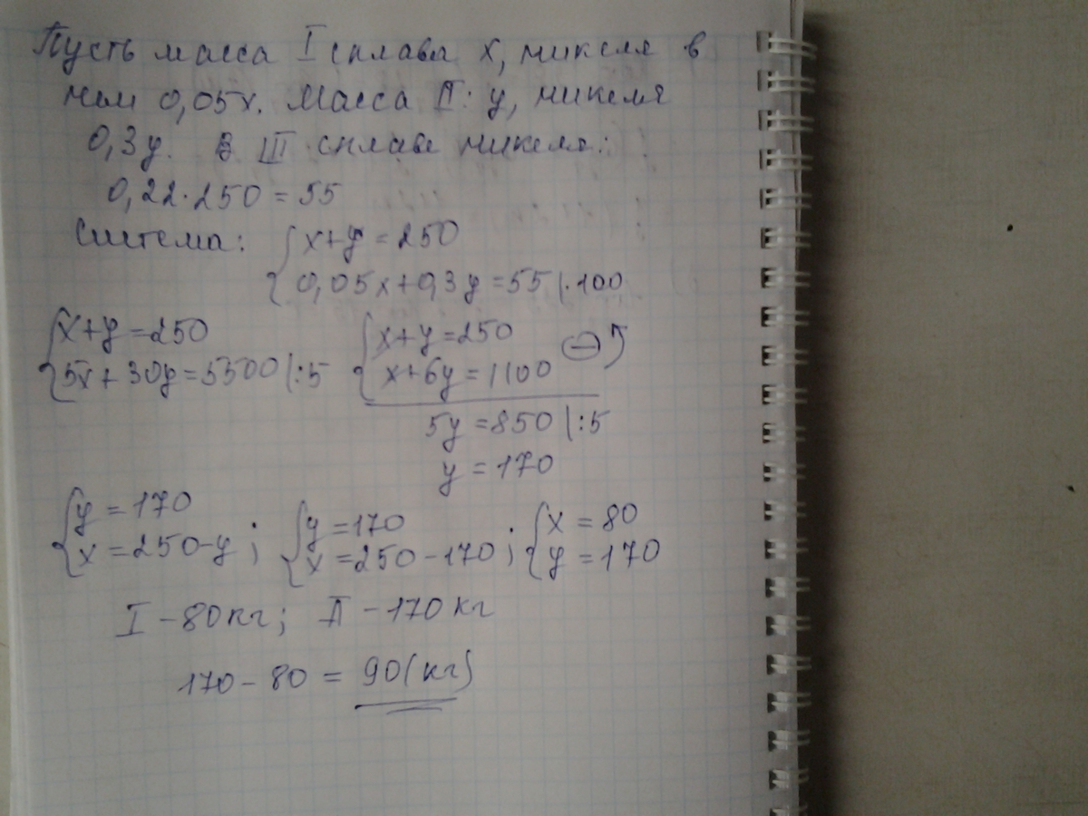 Имеется два сплава. Первый содержит 5% никеля, второй 30% никеля. Из этих двух сплавов получили третий сплав массой 250 кг, содержащий 22% никеля. На сколько кг масса первого сплава была меньше массы второго?