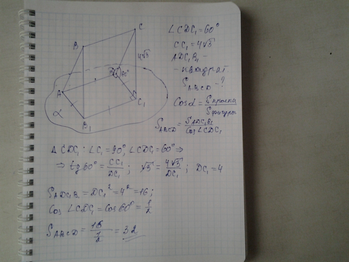 Сторона AD прямоугольника ABCD лежит в плоскости альфа, составляющей с плоскостью прямоугольника угол 60 градусов. Прямая BC удалена от плоскости альфа на 4 корня из 3 дм. Найдите площадь данного прямоугольника, если его ортогональная проекция на плоскость альфа - квадрат.