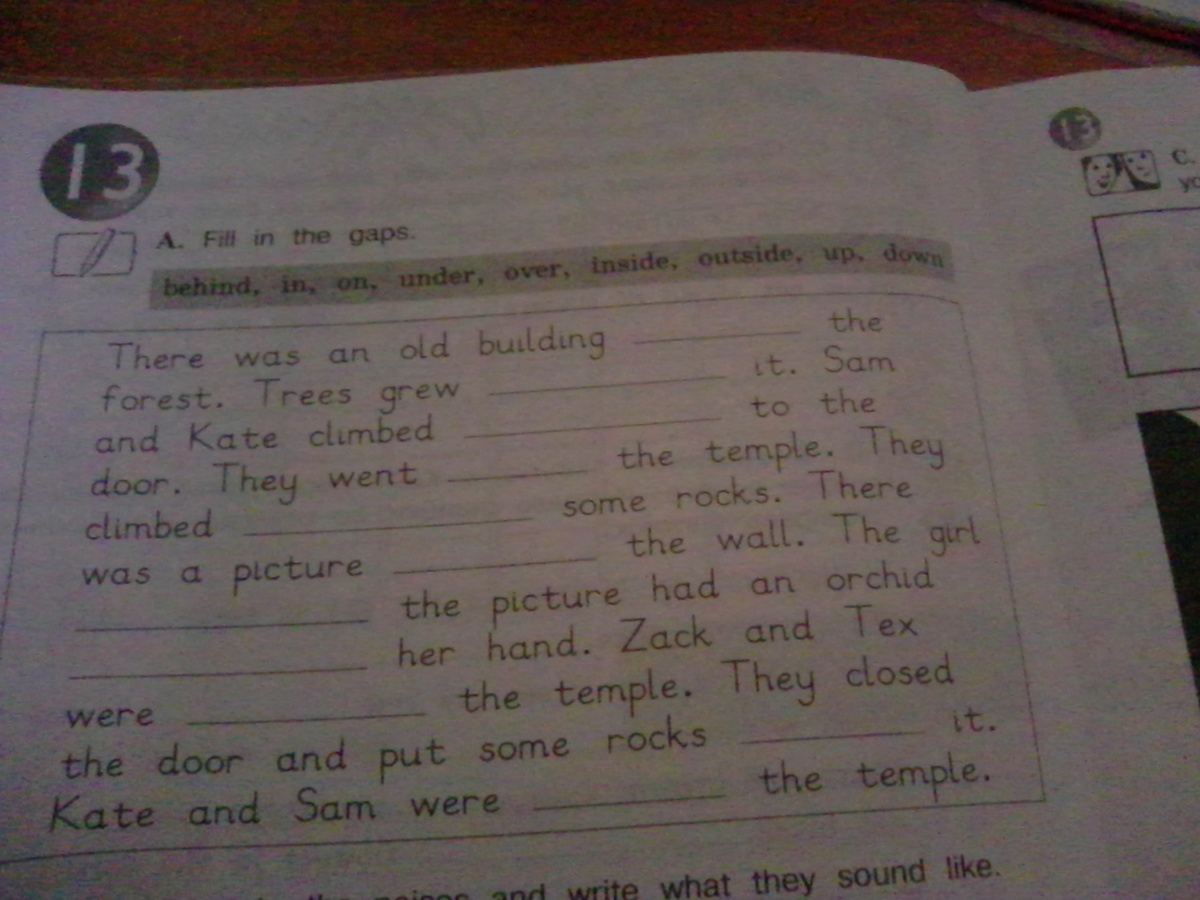 1)in 2)outside 3)up 4)inside 5)over 6)on 7)in 8)in 9)behind 10)outside 11)in