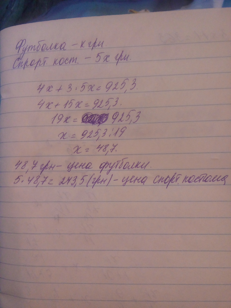 К футбольным соревнованиям преобрели 4 новых футболки и 3 спортивных костюма. Спортивный костюм , в 5 раз дороже футболки. За всю покупку заплатили 925,3 грн. Сколько стоит футболка и сколько стоит спортивный костюм.