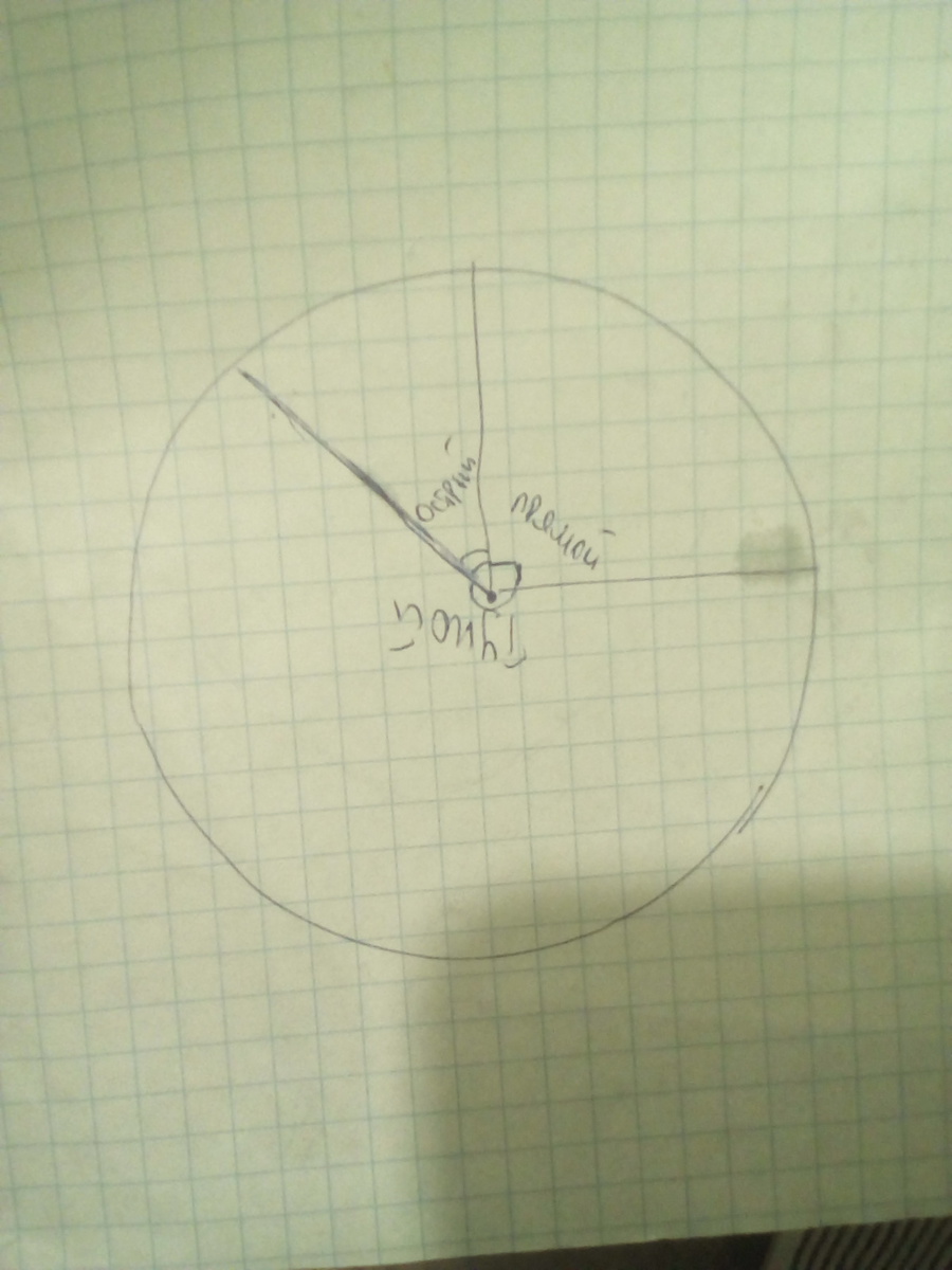 побудуй круг радиусом 3 см. Проведи в цьому 3 радиуси, щоб утворилися прямий, тупий и гострий кут.