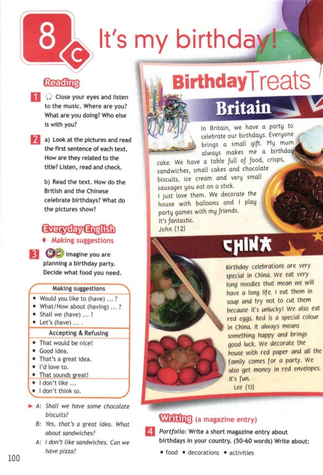 В Британии для празднования дня рождения устраивается вечеринка. Каждый приносит небольшой подарок. Моя мама всегда печёт мне праздничный торт. Стол ломится от еды, хрустящего картофеля, сэндвичей, маленьких пирожных и шоколадных бисквитов, мороженого и очень маленьких колбасок, которые едят с палочек.