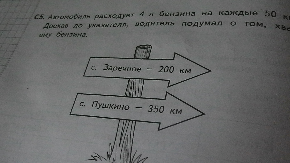 Автмобиль расходует 4 л бензина на каждые 50 км пути. Доехав до указателя, водитель подумал о том, хватит ли ему бензина. (смотрите прикрепленный файл)