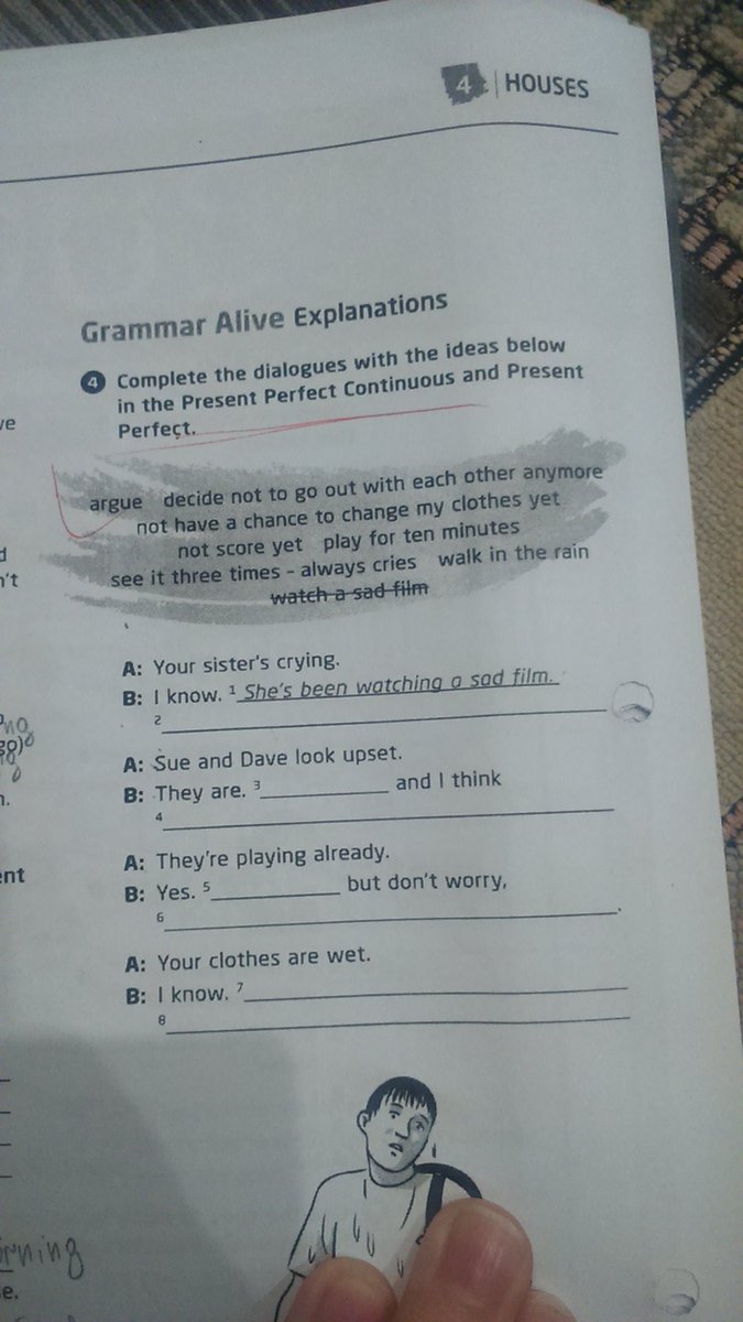 A: Your sister's crying.В: I know. She's been watching a sad film. She had seen it three times and always cries