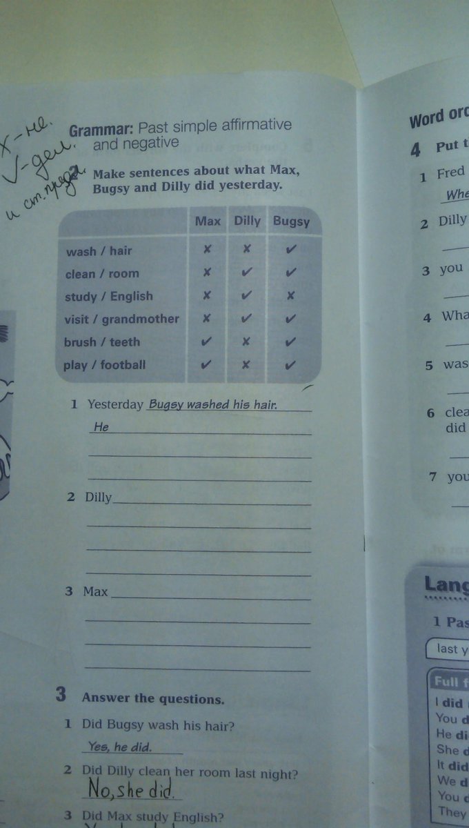 Помогите с этим номером,Крестик-не делали,галка-делали надо составить предложение по таблице про каждое го героя.Про Dilly (по таблице под цыфрой 2),Bugsy( про нё рассказать по таблице под цыфрой 1)Про Мах про него рассказать по таблице под цыфрой 3),если не понятно смотри по 1 примеру как составлено про Bugsy