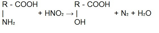 Реакция взаимодействия нитритной кислоты с аминокислотами происходит по схеме: (см. вложение)