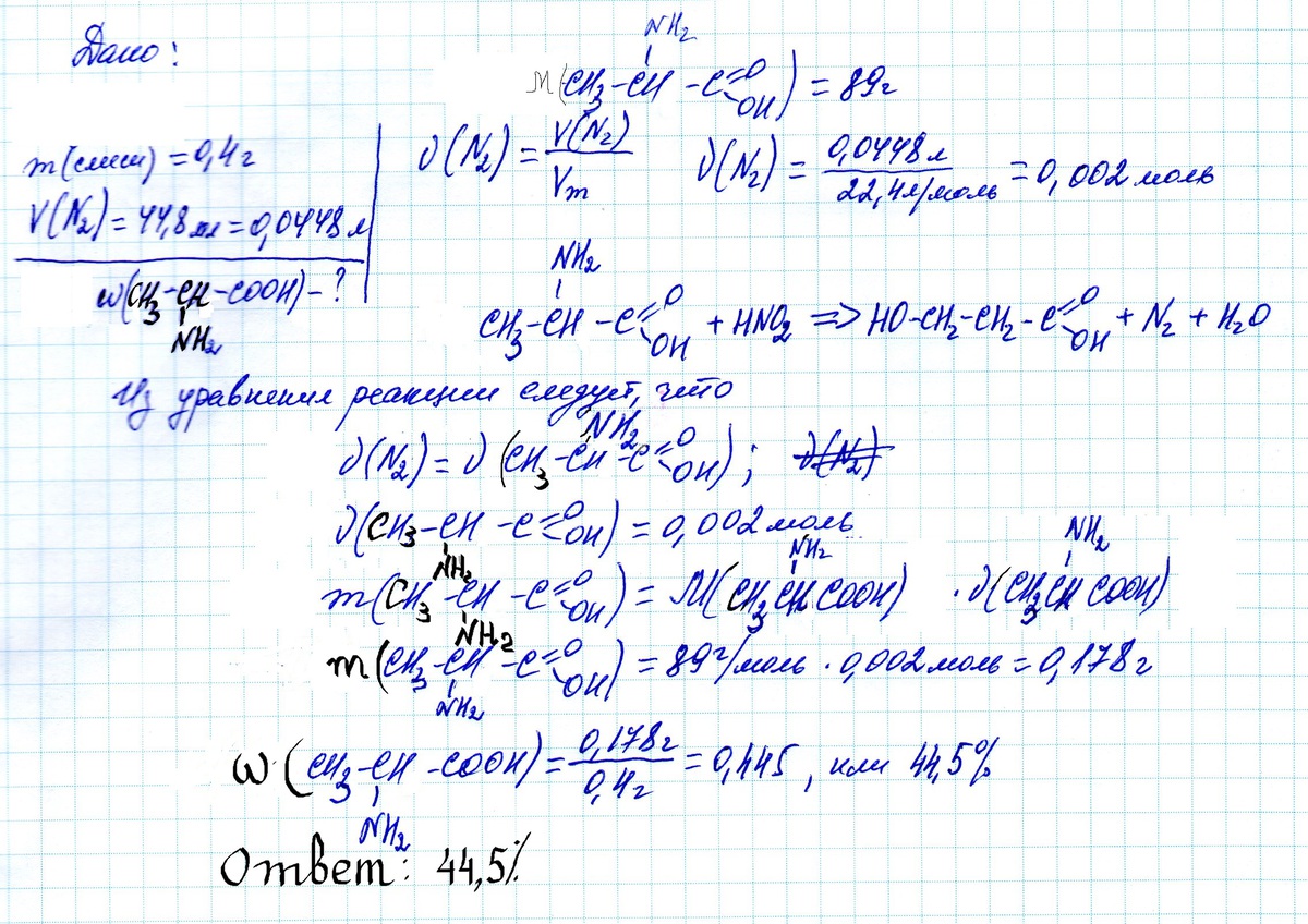 Сколько процентов аланина было в смеси, если в результате взаимодействия нитритной кислоты с 0,4 г этой смеси выделилось 44,8 мл азота (н.у)? (Ответ должен быть 45%)