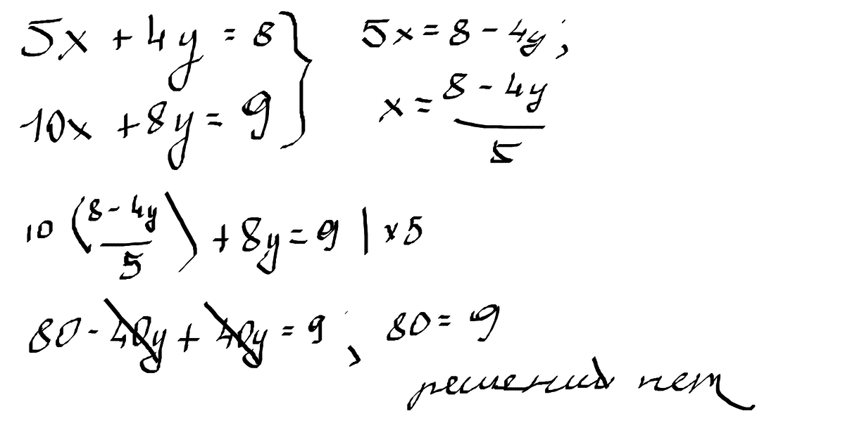 нет. из первого уравнения выразим х. х=(8-4у)/5. подставим во второе ур-е. получим: 16-8у+8у=9, 16=9. значит решений не имеет
