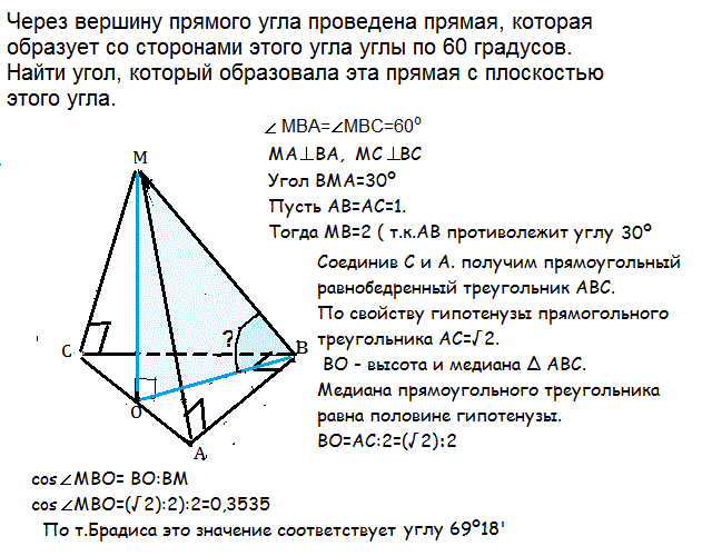 Итак, из вершины прямого угла провели наклонную, образующую с его сторонами углы, равные 60º Нужно найти угол наклона этой прямой к плоскости угла. Обозначим вершину угла В, На его сторонах отложим равные отрезки ВС и ВА. и проведем из А и С перпендикуляры к сторонам угла до пересечения с наклонной в точке М
