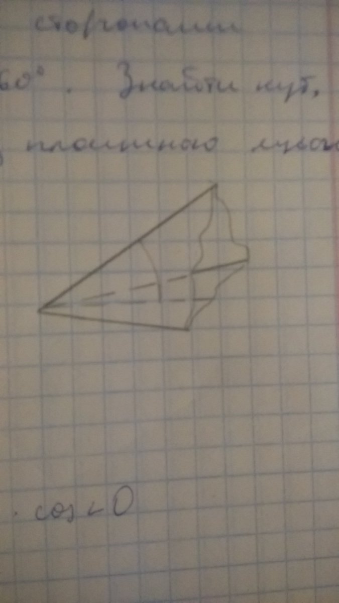 Через вершину прямого угла проведено прямую, которая образует со сторонами этого угла, углы по 60 градусов. Найти угол который образовала эта прямая с плоскостью этого угла. Помогите, пожалуйста!