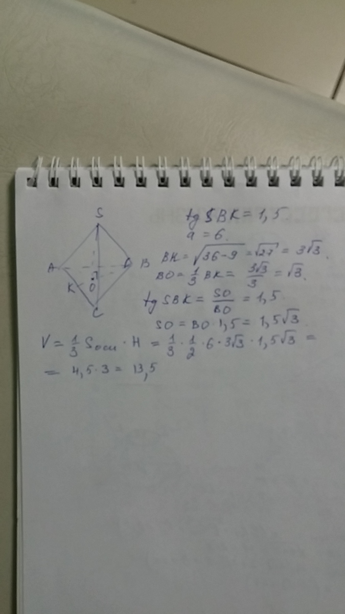 Найдите объем правильной треугольной пирамиды со стороной основания 6, боковое ребро которой наклонено к основанию под углом, тангенс которого равен 1,5.