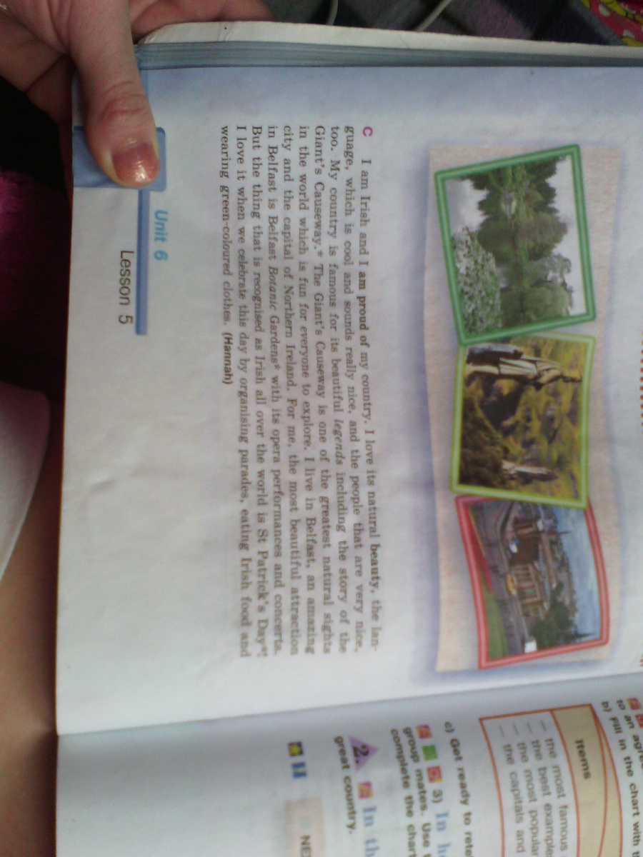 Я ирланка. Я горжусь своей страной. Я люблю её красивую природу,язык который классный и звуки очень приятные,и люди приятные тоже.Моя страна известна своими прекрасными легендами которые включают в себя легенду про Тропу Великанов.Я живу в Белфасте в прекрасной столице Северной Ирландии.Для меня лучшее место это Ботанический сад с оперными представлениями и концертами.Но вещь которая объединяет всех ирландцев всего мира это День Святого Патрика.Я люблю его потому что мы празднуем его парадами,едим ирландскую еду и одеваем зелёную одежду.