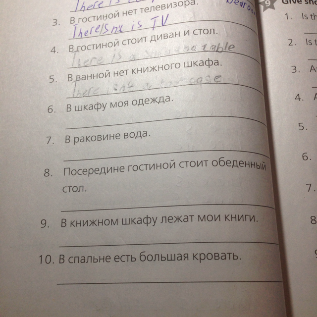 6. In my clothes closet. 7. In the sink water 8. middle of the living room is a dining table. 9. In the closet are my books. 10. The bedroom has a king size bed.