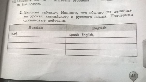 Заполни таблицу. Напиши, что обычно ты делаешь на уроках английского и русского языка. Подчеркни одинаковые действия.