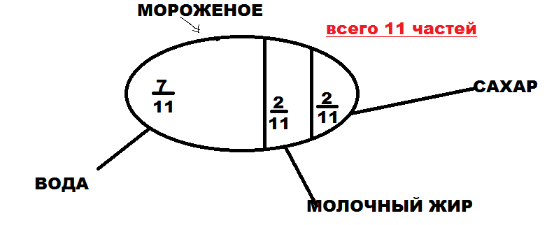 по-другому любую его часть можно представить в виде дроби:7/11 - вода, 2/11 мол.жир , и 2/11 - сахар