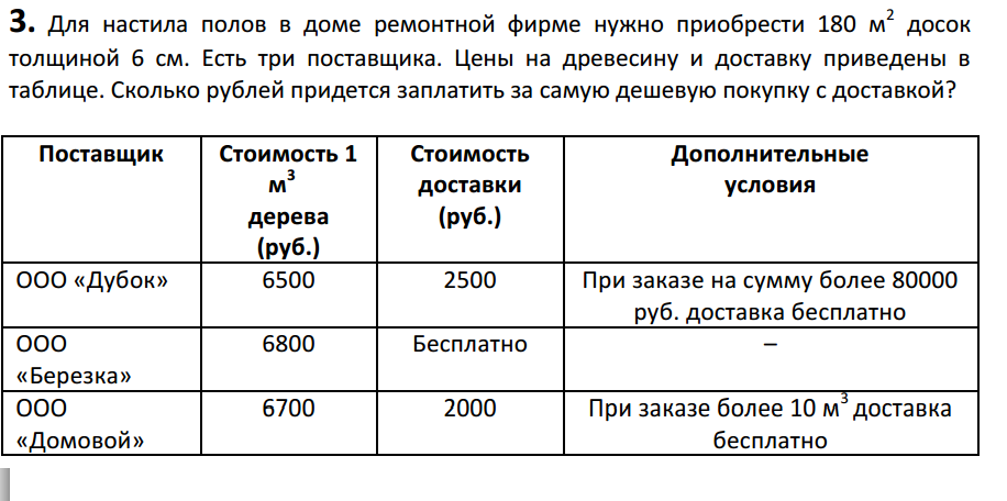 толщиной 6 см. Есть три поставщика. Цены на древесину и доставку приведены в