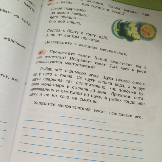 В предложениях часто используются имена существительные-то есть щука,нужно ставить местоимение-тобишь ОНА.А текст перепиши вставляя она,ее например :РЫБАК НЕС ЩУКУ.Она Сопротивлялась