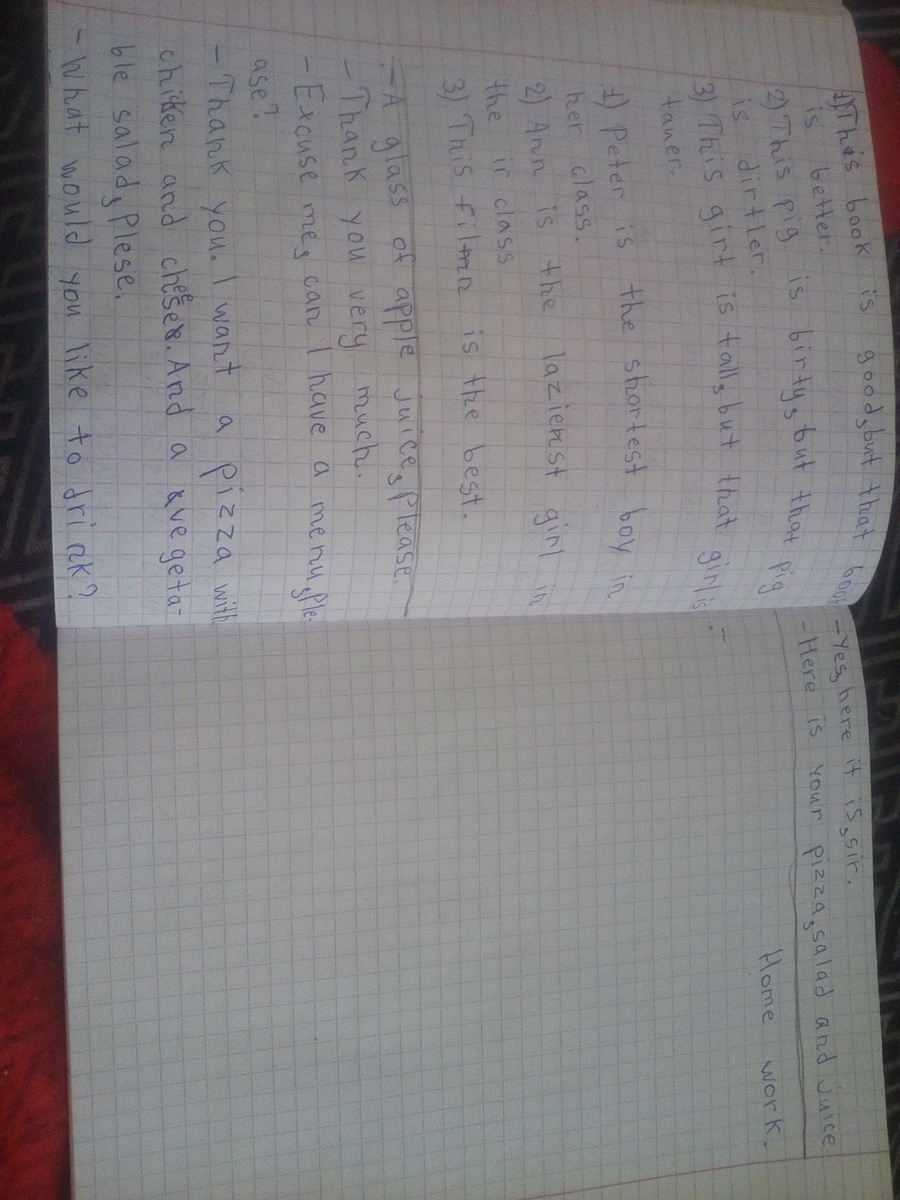 1)Excuse me, can I have a menu, Please? 2)Yes ,here it is, sir. 3)Thank you . I want a pizza with chiken and cheese . And a vegetable salad , please. 4) what would you like to drink? 5) A glass of apple juice , please. 6)Here is your pizza, salad and juice. 7)Thank you very much.