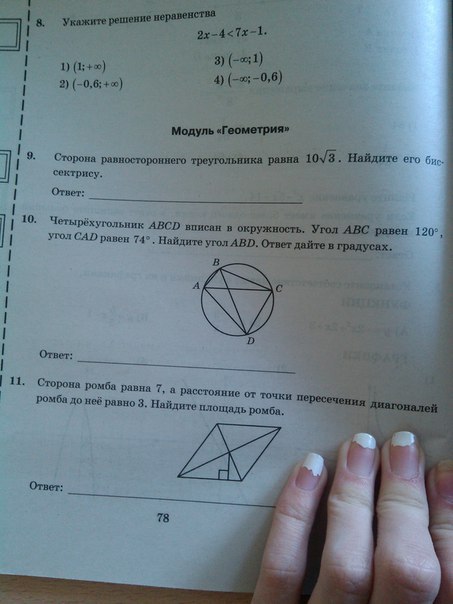 9) сначала нужно высчитать площадь. Используем формулу нахождения площади для равностороннего треугольника а^2*корень из 3 и поделить пополам. <br />(10*корень из 3)^2* корень из 3 / 2 = 100*3* корень из 3 /2 = 150 корней из 3. Это получилась площадь. Проводим биссектрису. В равностороннем треугольнике биссектриса является и высотой и медианой. Теперь используем стандартную формулу для нахождения площади треугольника. Высота*основание /2. Высоту обозначим за х. S=10 корней из 3*х /2 = 5 корней из 3*х. 5 корней из 3 *х= 150 корней из 3. х= 150 корней из 3 / 5 корней из 3. Х = 30.<br />* - умножение <br />/ - деление <br />^ - возведение в степень