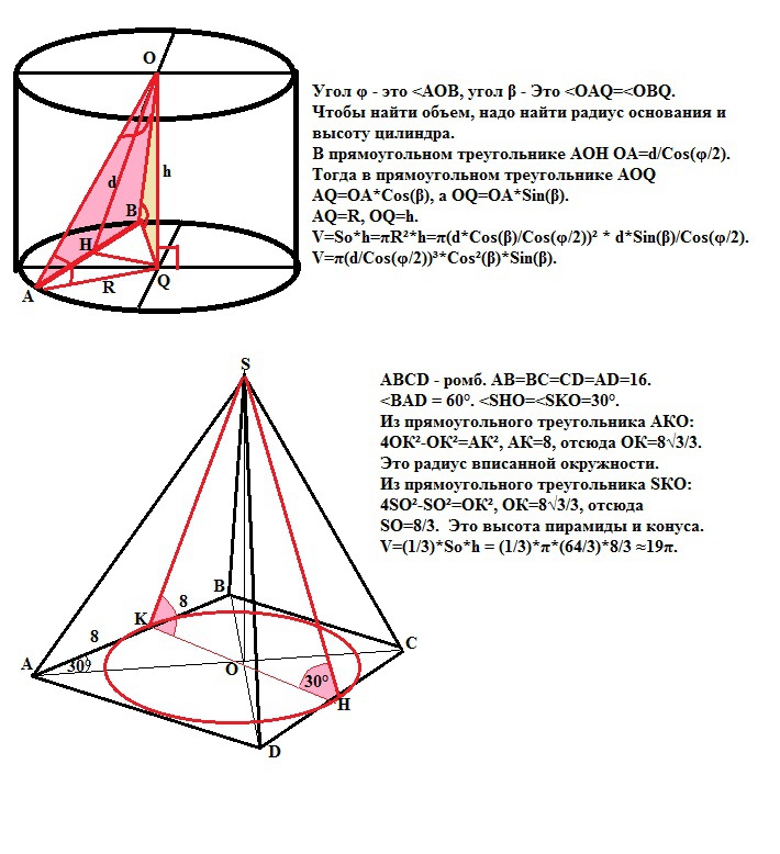 AQ=R, OQ=h. V=So*h=πR²*h=π(d*Cos(β)/Cos(φ/2))² * d*Sin(β)/Cos(φ/2).
