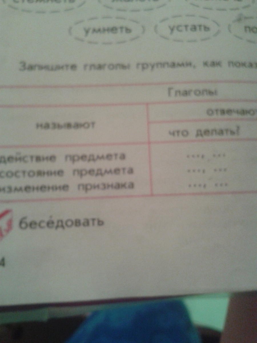 прочитайте слова и скажите, какой частью речи они являются. Что называет каждое из этих слов ( действие предмета, состояние предмета, изменение признака) и на какой вопрос отвечает? Выработать, спать, чернеть, загоревать, стемнеть, далеть, помочь, беседовать,умнеть, устать, ползти.
