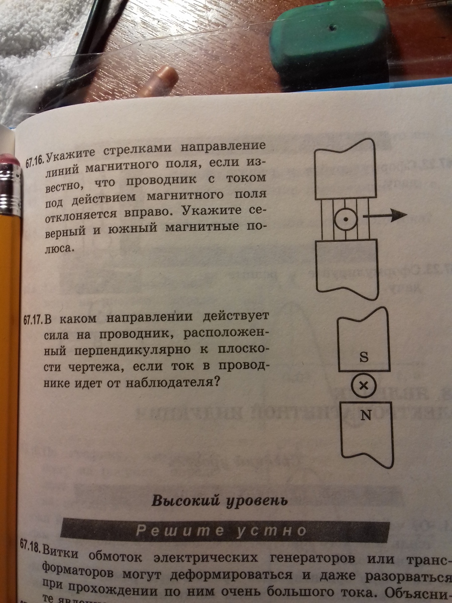 67.16 Обозначте полюса вверху N внизу S так принято в электротехнике и стрелки на линиях,направленные на S.