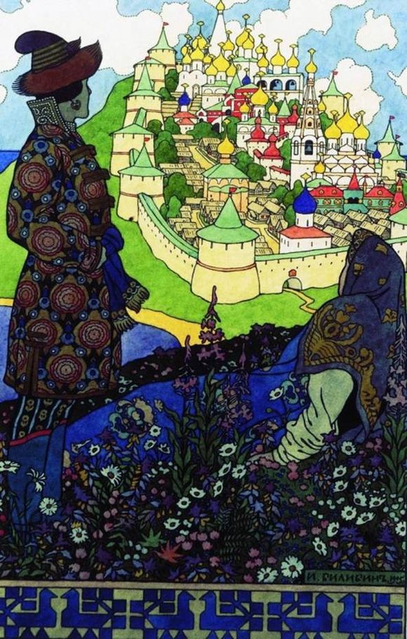 Эта сказка с ее многокрасочными картинами древнерусского быта дала богатую пищу билибинской фантазии. С поразительным мастерством и большим знанием изобразил художник старинные костюмы и утварь. В ее оформлении он достиг особого блеска и выдумки. Роскошные царские палаты сплошь покрыты узорами, росписью и украшениями. Здесь орнамент настолько обильно покрывает пол, потолок, стены, одежду царя и бояр, что все превращается в некое зыбкое видение, существующее в особом иллюзорном мире и готовое вот-вот исчезнуть.