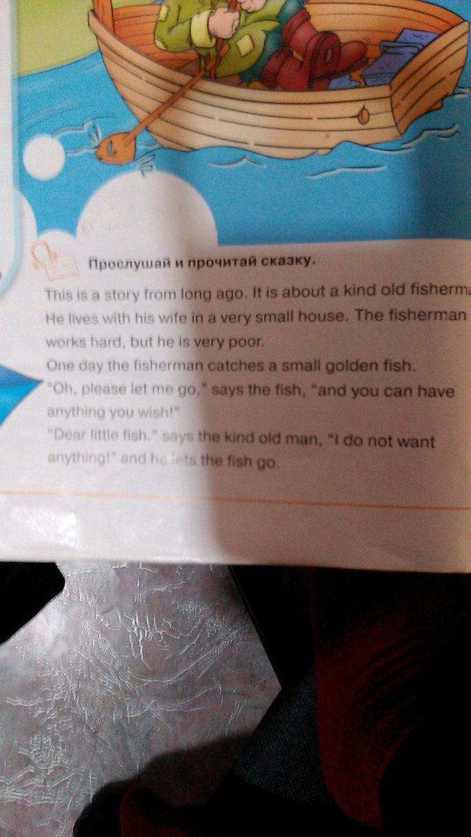 Это очень давняя история. Она о добром, старом рыбаке. Он живет со своей женой в очень маленьком доме. Рыбак работает усердно, но он очень беден. Однажды рыбак ловит маленькую золотую рыбку. "О, пожалуйста, отпусти меня" - сказала рыбка " и ты сможешь иметь все, что захочешь!"