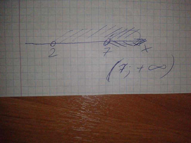 изобразите на координатной прямой пересечение множеств решений неравенств и запишите с промежутками x>2 x>7