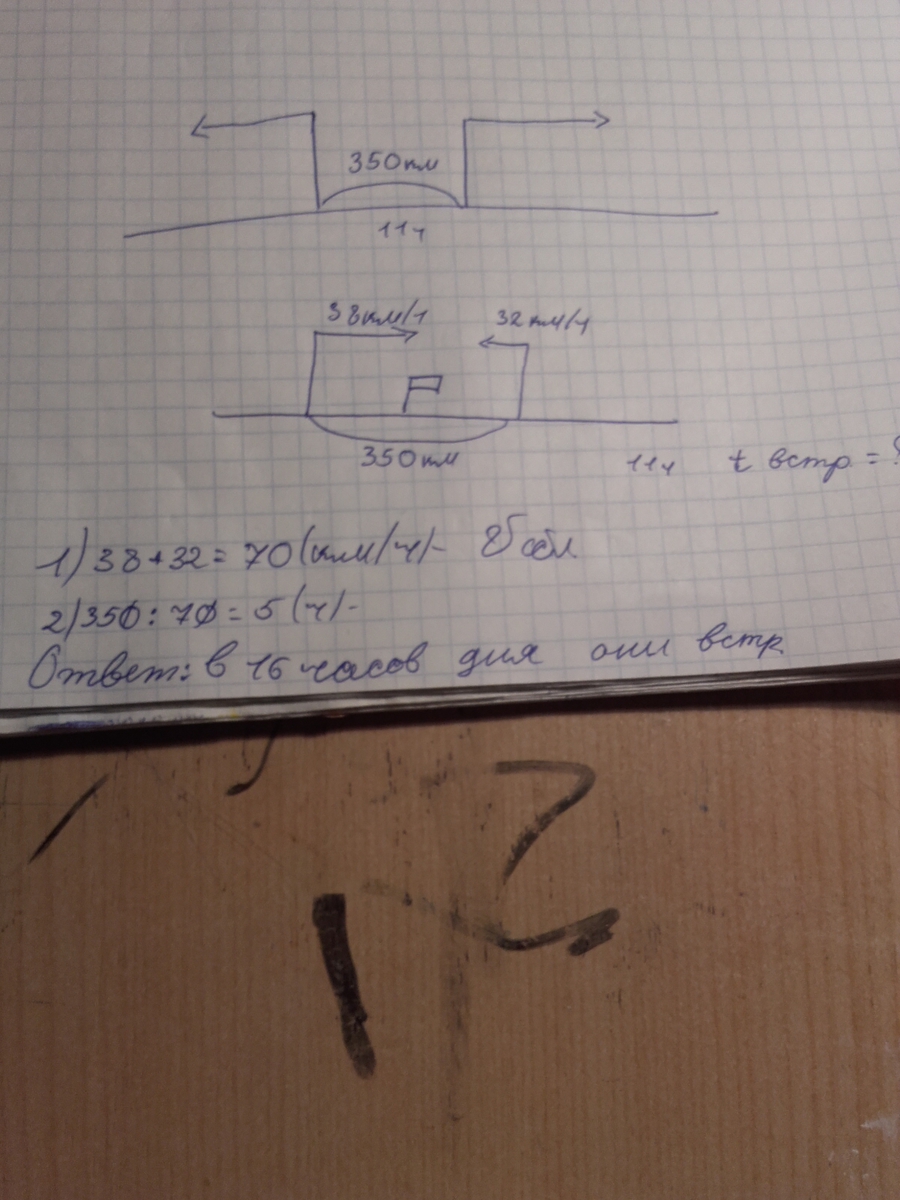 от двух пристаней (расст.350км) , в 11 часов вышли на встречу друг другу два теплохода . скорость 1-го 32 км/ч, скорость 2-го 38 км/ч .В какое время они