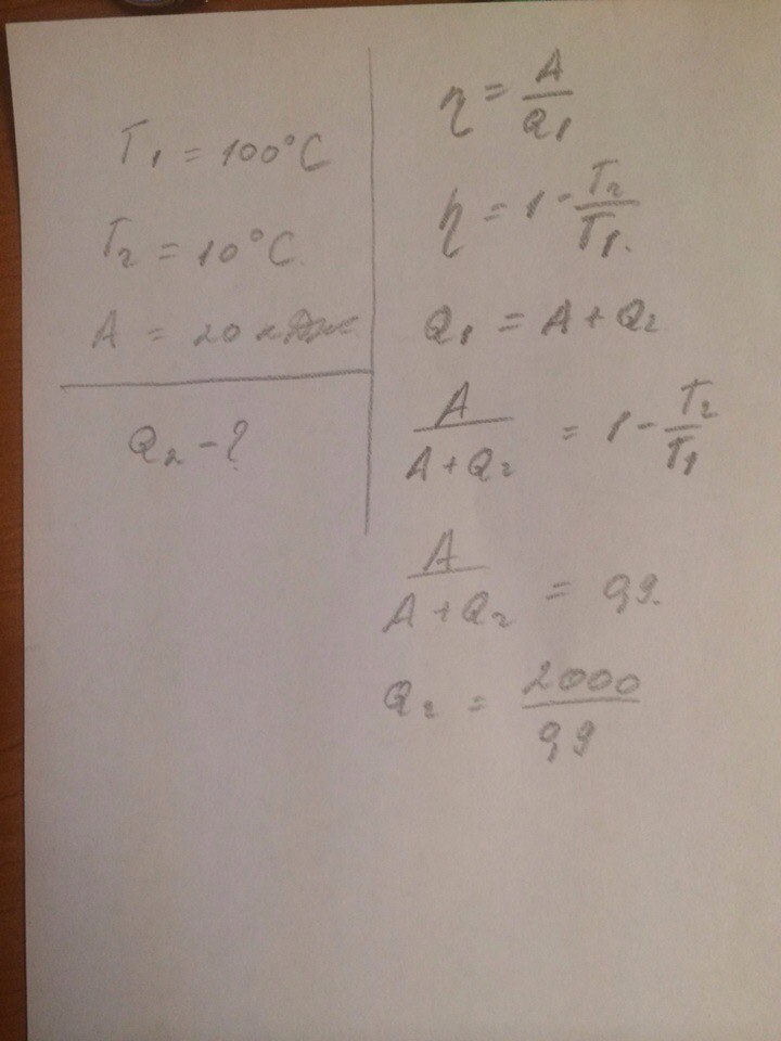 Температура нагревания идеального теплового двигателя 100° С, а холодильника 10° С. Какое количество теплоты отдается холодильнику за 1 с, если двигатель ежесекундно получает от нагревателя 20 кДж энергии?