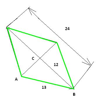 площадь ромба равна половине произведений его диагоналей. из прямоугольного треугольника АВС см. рисунок находим AC
