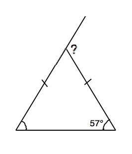 Внешний угол при вершине треугольника равен сумме двух внутренних, не смежных с ним углов. Так как дан равнобедренный треугольник, то оба угла при его основании равны 57°, а внешний угол при вершине, противолежащей основанию равен 2•57°=114°