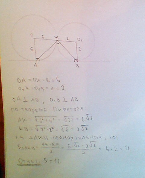 окружности радиусов 2 и 6 касаются внешним образом в точке k некоторая прямая касается этих окружностей в точках а и в найдите площадь треугольника акв