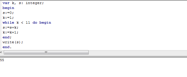 var k, s: integer; begin s:=0; k:=1; while k < 11 do begin s:=s+k; k:=k+1; end; write(s); end. Определите, что будет напечатано в результате работы следующего фрагмента программы: