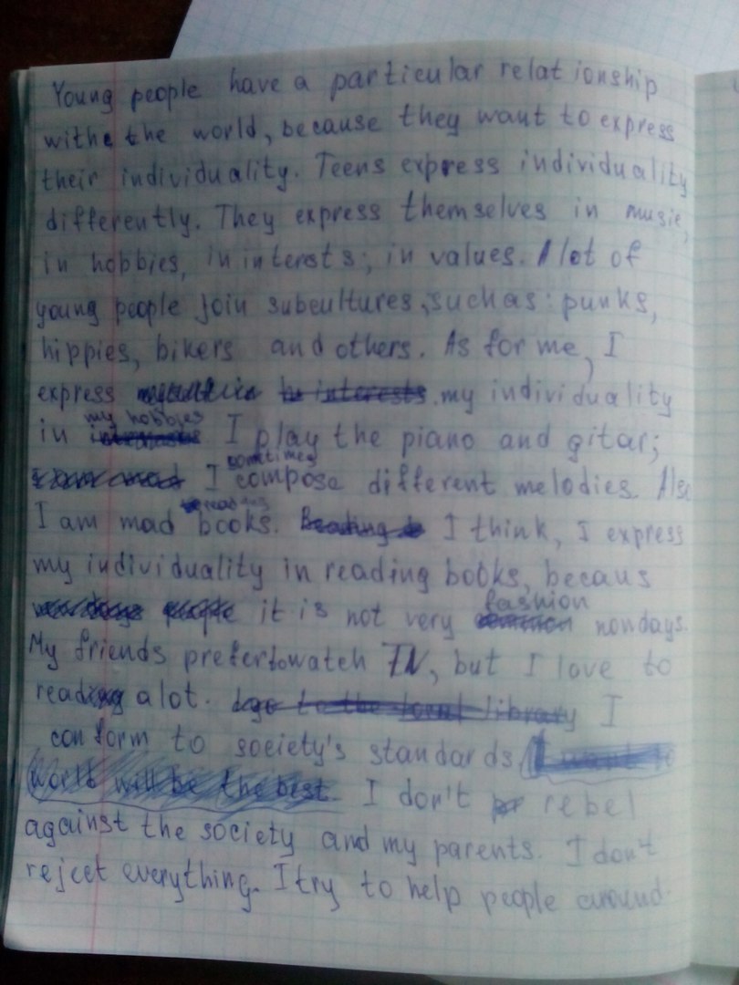 Young people have a particular relationship with the world, becouse they want to express their individuality. Teers express individuality differently. They express themselves in music, hobbies, in interest.