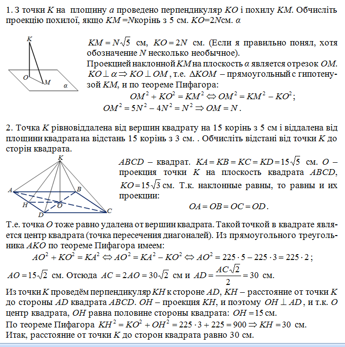 2.точка К рівновіддалена від вершин квадрату на 15корінь з 5 см. і віддалена від площини квадрата на відстань 15корінь з 3 см. . Обчисліть відстані від точки К до сторін квадрата.