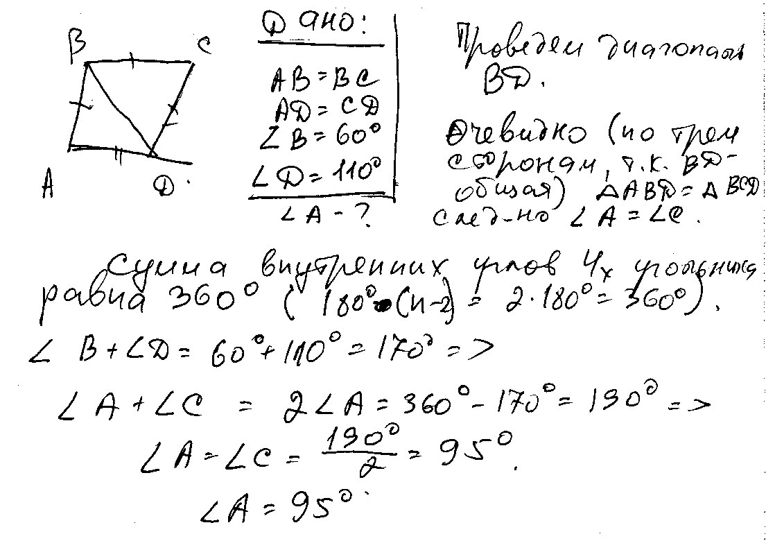 в выпуклом четырехугольнике abcd, ab=bc, ad=dc, угол b=60 градусов, угол d=110 градусов. найдите угол a