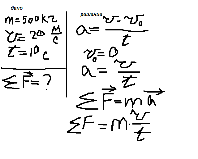 Автомобиль массой 500кг, разгоняясь с места равноускоренно,достиг скорости 20м/с за 10сек. Равнодействующая всех сил,действующих на автомобиль равно?