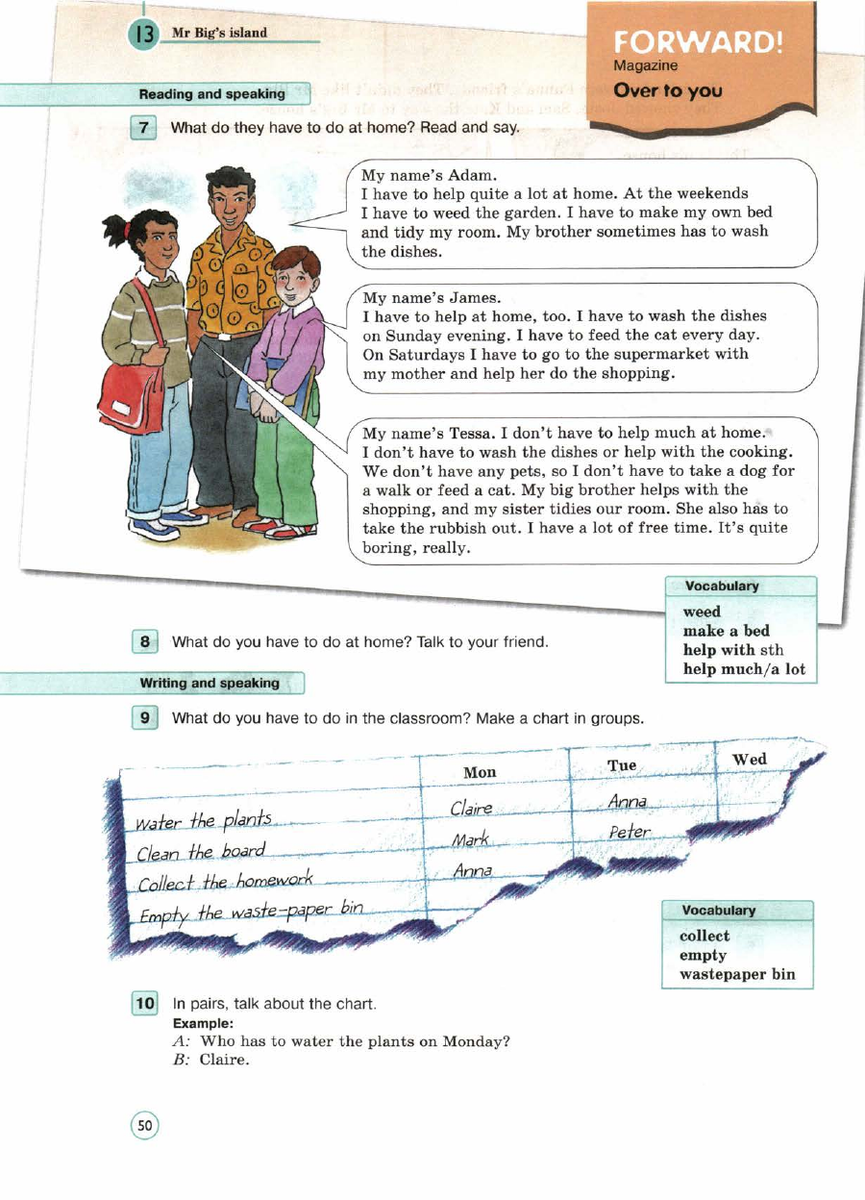 Меня зовут Джеймс.Я помогаю по дому тоже. Я мою посуду в Воскресенье вечером.Я кормлю своего кота каждый день.В Субботу я хожу в супермаркет с моей мамой и помогаю ей совершать покупки.