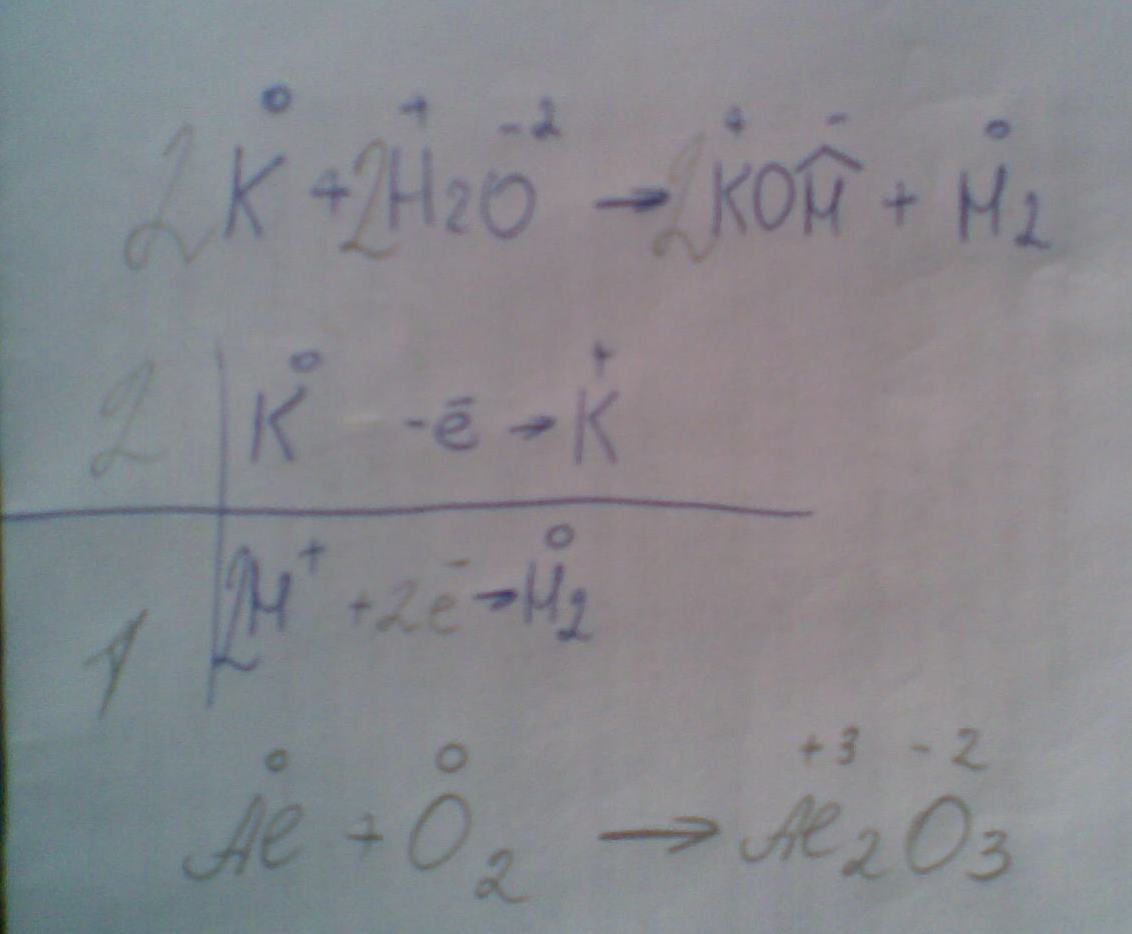 Расставьте коэффициенты в уравнениях ОВР с помощью схем электронного баланса: 1) K+H2O=KOH+H2 2) Al+O2=Al2O3 3) Hg=HNO3(р)=Hg(NO3)2+NO+H2O