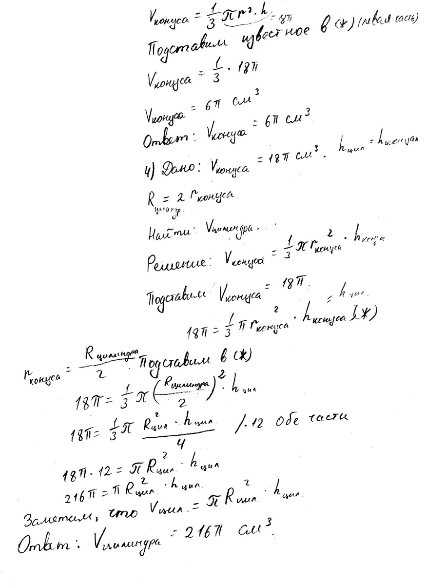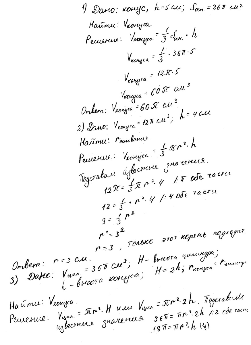 3. Объем цилиндра равен 36п см3. Чему равен объем конуса с таким же основанием и высотой, вдвое меньше высоты цилиндра?