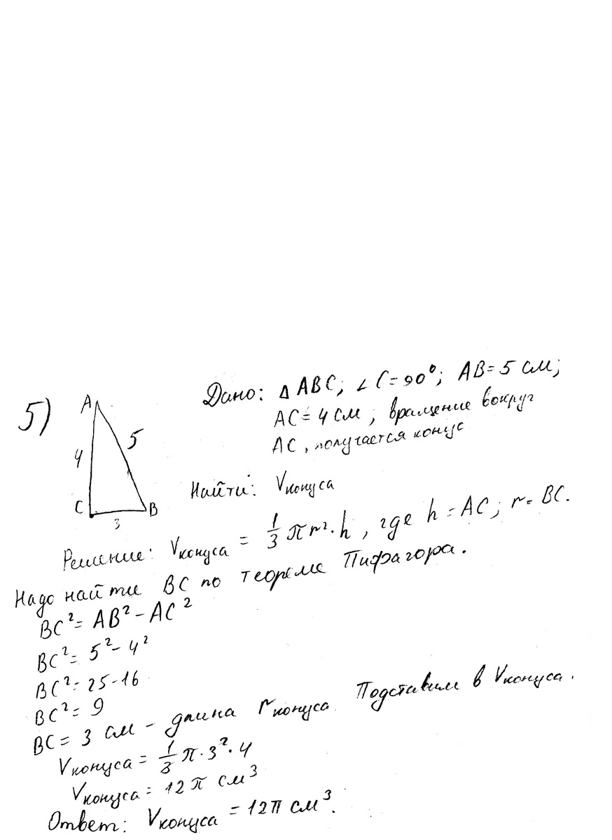 5. Прямоугольный треугольник с гипотенузой 5 см и катетом 4 см вращается вокруг этого катета. Найдите объем тела вращения.