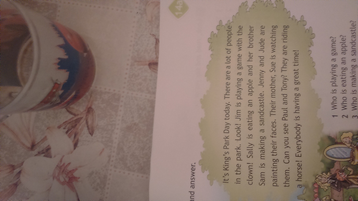 Это прекрасны день для парка сегодня.Есть много людей в парке.Смотри!Джим играет в игру с клоуном!Салли ест яблоко и ее брат Сэм делает