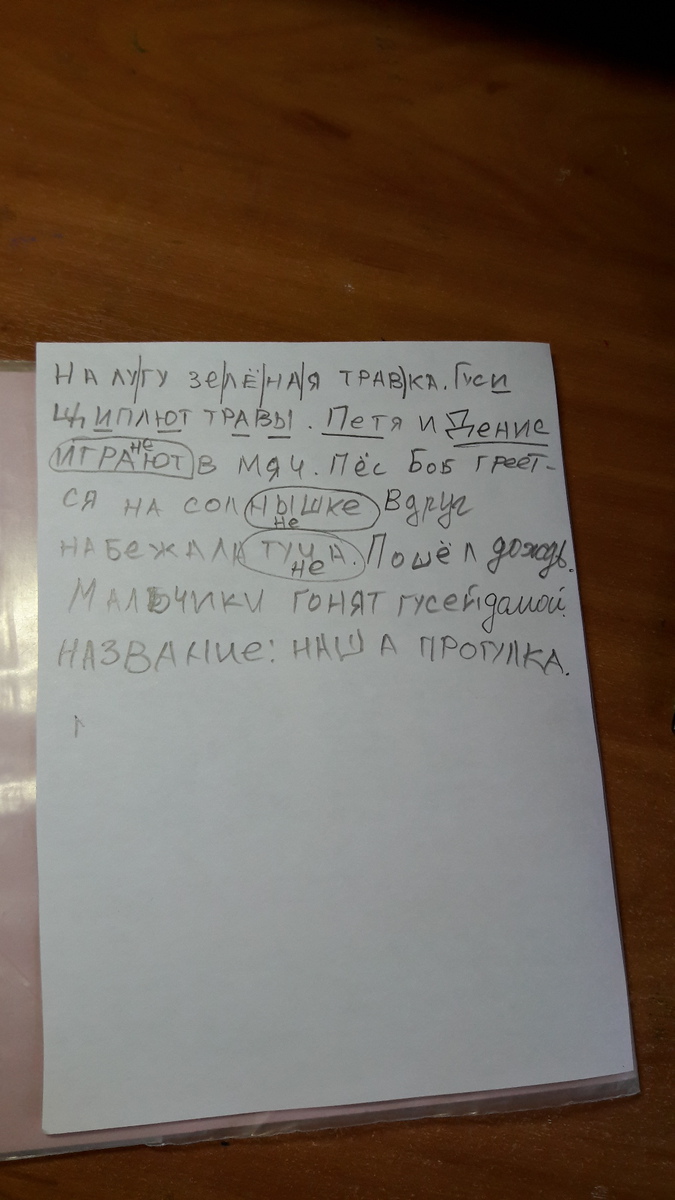 На лугу зелёная травка. Гуси щиплют травы. Петя и Денис играют в мяч. Пёс Боб греется на солнышке. Вдруг набежала туча. Пошёл дождь. Мальчики гонят гусей домой.