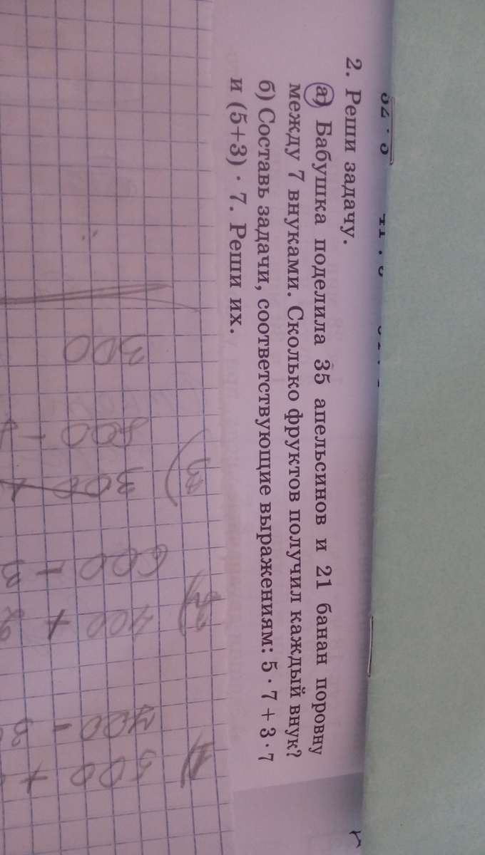 Бабушка поделила 35 апельсинов и 21 банан поровну между 7 внуками.Сколько фруктов получил каждый внук?