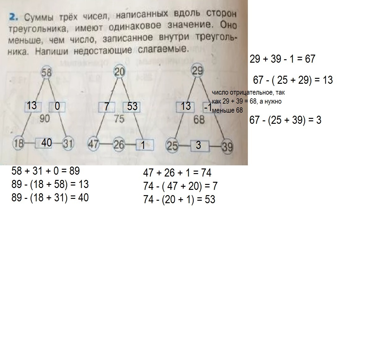 суммы трёх чисел написанных вдоль сторон треугольника имеют одинаковое значение оно меньше чем число записанное внутри треуголника напиши недостающие слагаемые. 18,58,31,(90) это в середине. 47.20.26.(75)это в середине. 25. 29.39. (68)это в середине.