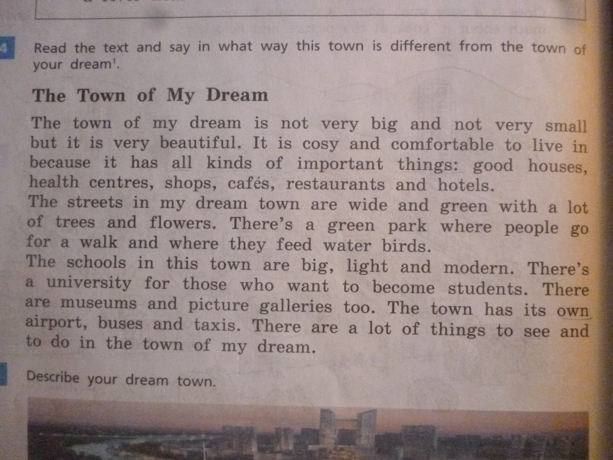 Школы в жтом городе большие , светлые и современные . Там так же есть музеи и картинные галереи . У города имеется так же свой личный аэропорт , автобусы и такси . Есть много чего , то можно увидеть и сделать в городе моей мечты .