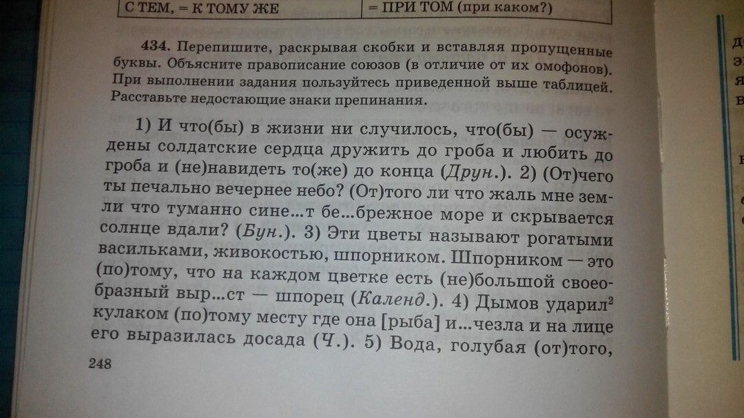1.И что(бы) в жизни ни случилось, что(бы) — осуждены солдатские сердца дружить до гроба и любить до гроба и ненавидеть то(же) до конца. 2.(От)чего ты печально вечернее небо? (От)того ли что жаль мне земли что туманно сине…т бе…брежное море и скрывается солнце вдали? 3. Эти цветы называют рогатыми васильками, живокостью, шпорником. Шпорником-это (по)тому, что на каждом цветке есть (не)большой своеобразный выр..ст – шпорец.