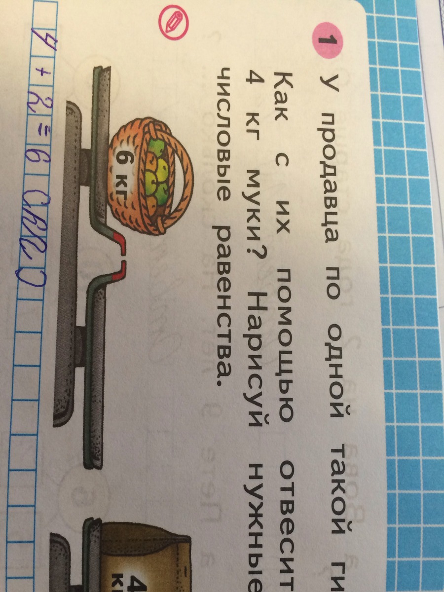 У продавца по одной гире: 5кг, 3кг, 2кг. Как с их помощью отвесить 6 кг яблок? 4 кг муки? Нарисуй нужные гири. Запиши числовые равенства.